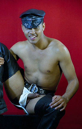 STEPHE – AFRO-ITALIAN-AMERICAN MODEL – SEATED ON THE BLACK CUBE IN HIS OWN CHAPS & WHITE JOCKSTRAP AND LEATHER CAP & BELTCourtesy of PETER BERLIN (1995) • STEPHE BOOK (2018)