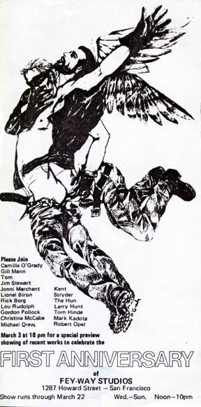![]() Robert Opel is depicted as a leather angel in this incredible erotic ink drawing by Camille O'Grady which served as the centerpiece of this the first and only anniversary exhibition held at Robert's Fey Way Studios from March 3 through 22, 1979. The publicity flyer lists the names of the 18 participants which includes "Tom" better known as Tom of Finland. Several of these artists had individual shows at Fey-Way. Robert Opel was a good friend and collaborator in the late 70s when I first moved to San Francisco. My contribution to this exhibition the only time I exhibited at Fey-Way Studios was a circular photo collage of myself made of an original old b/w Polaroid picture and photocopies made from the image. Like most works exhibited, it remained unsold. I never even bothered to pick it up after the show which was my way of giving it to Robert. Watch for more memorabilia and the story of Robert Opel's assassination by a crazed gunman in his living area behind the gallery less than six months after this exhibition. In the meantime, for more information, click on: |