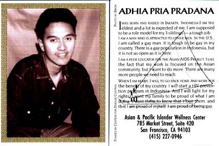 ![]() ADHIA PRIA PRADANA: I was born and raised in Jakarta, Indonesia. I am the eldest an a lot is expected of me. I am supposed to be a role model for my 3 siblings -- a tough job. I am a man who is attracted to other men. In the U.S., I am called a gay man. It is tough to be gay in my country. There is a gay population in Indonesia, but it is not as open as it is here. I am a peer educator with the Asian AIDS Project [now A&PIWC]. I like the fact that my work is focused on the Asian community, but I want to do more. There are many more people we need to reach. When I am ready, I will go back home and work for the benefit of my country. I will start a HIV prevention program in Indonesia. And I will fight for my rights. I want my family to be proud of what I am doing. I want them to know that I love them, and that I am proud of myself. I am proud of being gay. | ||