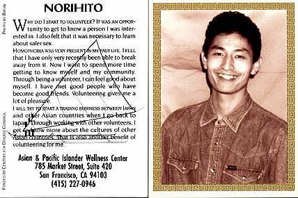 ![]() NORIHITO: Why did I start to volunteer? It was an opportunity to get to know a person I was interested in. I also felt that it was necessary to learn about safe sex. Homophobia was very present in my past life. I feel that I have only very recently been able to to break away from it. Now I want to spend more time getting to know myself and my community. Through being a volunteer, I can feel good about myself. I have met good people who have become good friends. Volunteering gives me a lot of pleasure. I will try to start a trading business between Japan and other Asian countries when I go back to Japan. Through working with other volunteers, I get to know more about the cultures of other Asian countries. That is also another benefit of volunteering for me. | ||