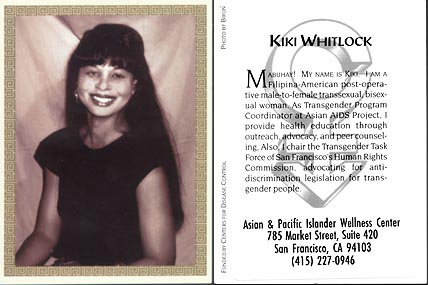 ![]() KIKI WHITLOCK: Mabuhay! My name is Kiki. I am a Filipina-American post-operative male-to-female transsexual bisexual woman. As Transgender Program Coordinator at Asian AIDS Project [now A&PIWC]. I provide health education through outreach, advocacy, and peer counseling. Also I chair the Transgender Task Force of San Francisco's Human Rights Commission, advocating for anti-discrimination legislation for transgender people. | ||