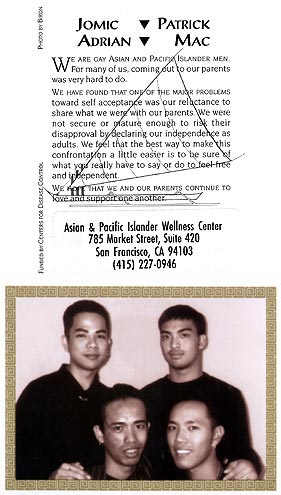 These Photographs were all taken one Saturday afternoon in September 1994 at the offices of the Asian AIDS Project [now the A&PIWC] in San Francisco. These cards, funded by the Centers for Disease Control, are four of many produced as part of a broader outreach program that provided information on the prevention of sexually transmitted diseases, as well as peer-counseling and support for people in the Asian & Pacific Islander community with HIV and AIDS. As of May 1997, the cards are still being used to positively introduce people to the realities of AIDS and Lesbian, Gay, and Transgender lifestyles. I am proud to have been associated with the card project and I dedicate this page to the staff and enthusiastic volunteers of the Asian & Pacific Islander Wellness Center. Should you wish to assist in the work of the Wellness Center, you can send your contribution directly to the address above, or -- if you live in the area -- and would like to volunteer your time or services, please phone the Center at (415) 227-0946. You can also go directly the the Wellness Center's web page where you can get additional information, if you click on the Center's name at the top of this page. |